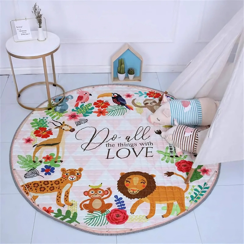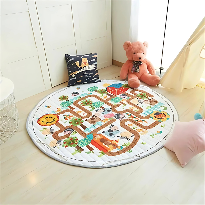 Designed for both fun and function, this play mat is made with a non-slip bottom to keep it secure on any surface. The soft cotton and polyester blend on top feels gentle on delicate skin, while the cushioned filling provides extra support. Whether kids are rolling, sitting, or lying down, they’ll feel comfortable and secure. Plus, the large round shape gives plenty of space for multiple kids to play together.